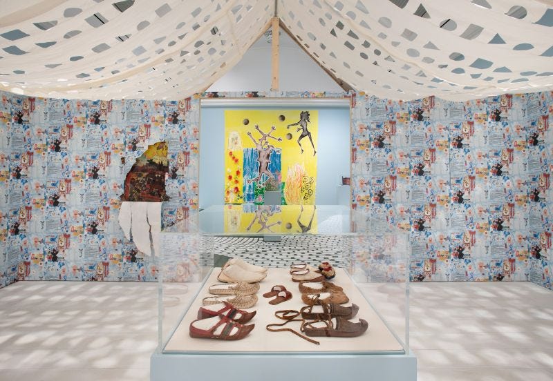 She is standing inside her Witch House (2026), a structure covered with wallpaper printed with a painting she made in 2005 that featured a slogan from The S*n newspaper - “Meet Your Neighbours” - backing a campaign by the Conservative Party to strip Gypsy Roma and Traveller people of their human rights. It’s a “destructive rhetoric that disgusts me whenever I see it,” Le Bas has written in a guide to the exhibition. Her Romany heritage is just one of the many influences in her work, which include her studies in fashion design and her deep engagement with folklore and witchcraft.