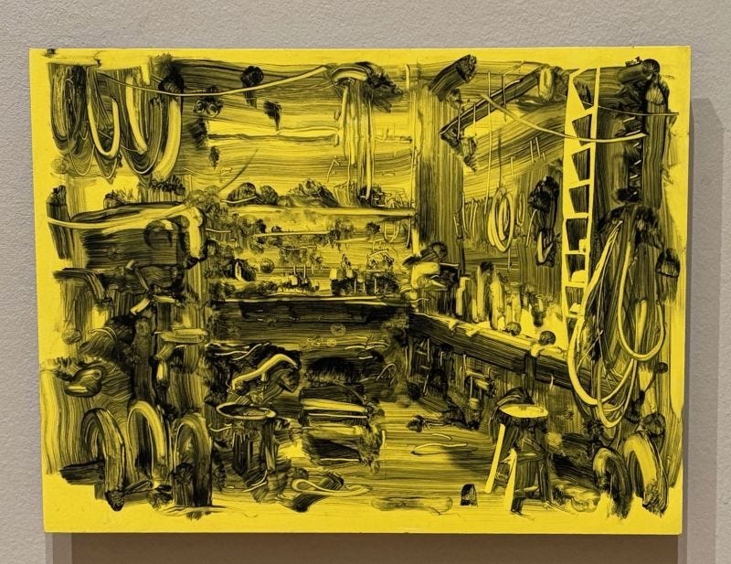 Appreciating these works require a new way of seeing - or rather looking, as it’s an active process rather than a passive one. As the exhibition title states, Crowley paints the shadows rather than the objects in the scene: A ladder can be recognised as a ladder through the yellow patches left bare by Crowley’s brush. The legs of a stool are not so much embathed in light as abandoned by shade.