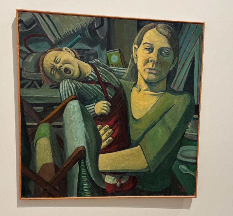 Running chronologically, it starts with the 1970 National Women’s Liberation Conference at a time when there was no Equal Pay Act, no statutory maternity rights or sex-discrimination protection, and married women were still the legal dependents of their husbands. The dull-eyed gaze and resigned, motionless posture of the woman in Maureen Scott’s oil painting Mother and Child at Breaking Point - in contrast to her toddler’s entire body in motion, torso-arched, head flung back, mouth wide open in a wail - demonstrates the sometimes repressive exhaustion of motherhood. Yet its very existence is a protest - a drawing-to-attention of the conflicting emotions of being a mum.